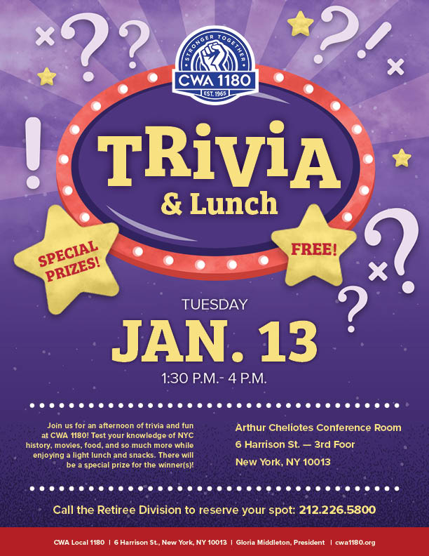 | Tues. 1/13 | IN-PERSON Review of Online Lessons / Q&A | 6 Harrison St. Call the Retiree Division to reserve your spot today: 212.226.5800 |