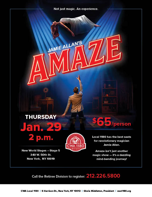 1/29 | Amaze $65/person | New World Stages – Stage 5 Call the Retiree Division to reserve your spot today: 212.226.5800 |